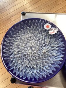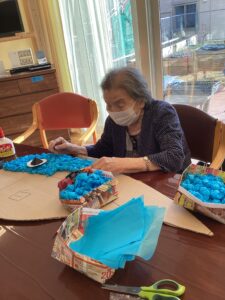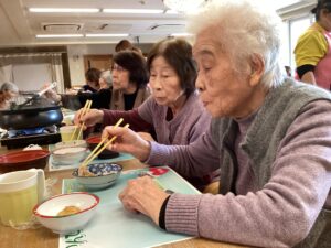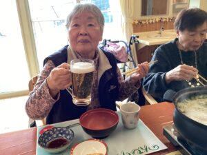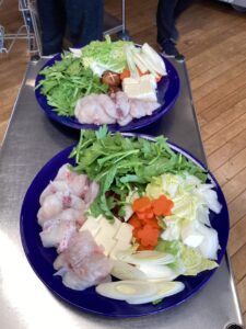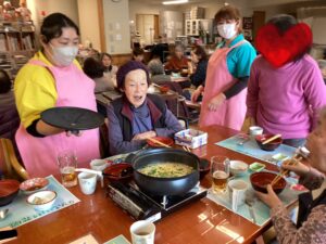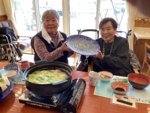お鍋の準備もしながら、利用者様にお刺身を配っていきます😊