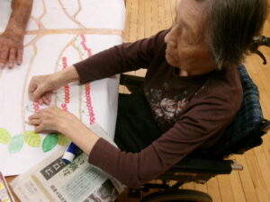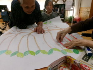 その季節に応じた果物や葉を書いて色塗りをして